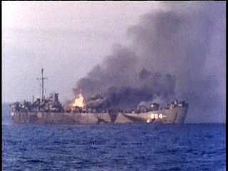On Fire — Fire engulfs LST-884 from Japanese kamikaze attack at Okinawa on 1 April 1945. (Stuart Flockencier family photos)