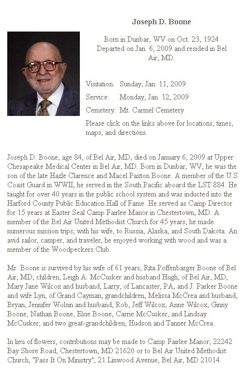 01.06.2009: Shipmate Mr. Joseph Boone 01.05.2009: Shipmate Mr. Al Geary Sr. Al's Memorial .DOC .PDF 09.11.1998: Shipmate Mr. Harry C Pelt (Best information I have found)